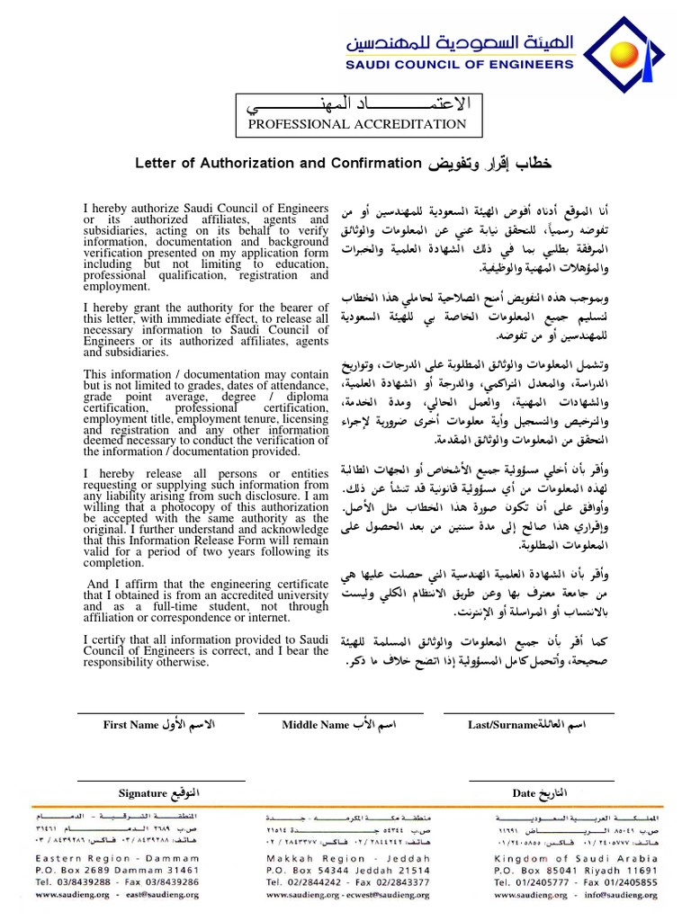 خطاب الاقرار والتفويض للهيئة السعودية للمهندسين